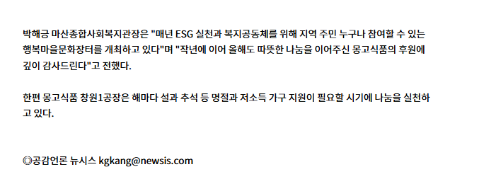 박해긍 마산종합사회복지관장은 "매년 ESG 실천과 복지공동체를 위해 지역 주민 누구나 참여할 수 있는 행복마을문화장터를 개최하고 있다"며 "작년에 이어 올해도 따뜻한 나눔을 이어주신 몽고식품의 후원에 깊이 감사드린다"고 전했다.
