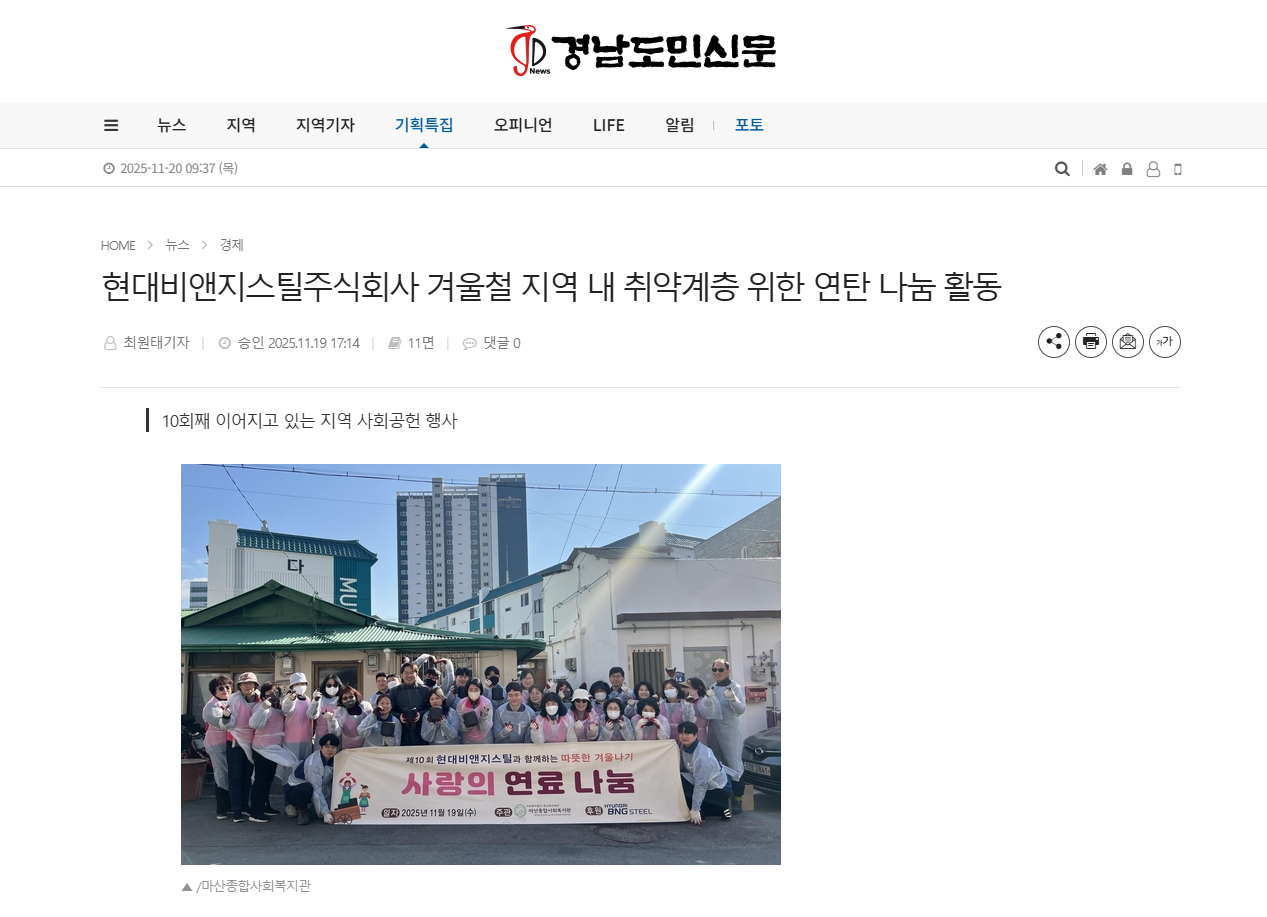 현대비앤지스틸주식회사 겨울철 지역 내 취약계층 위한 연탄 나눔 활동<경남도민신문 외 2곳>