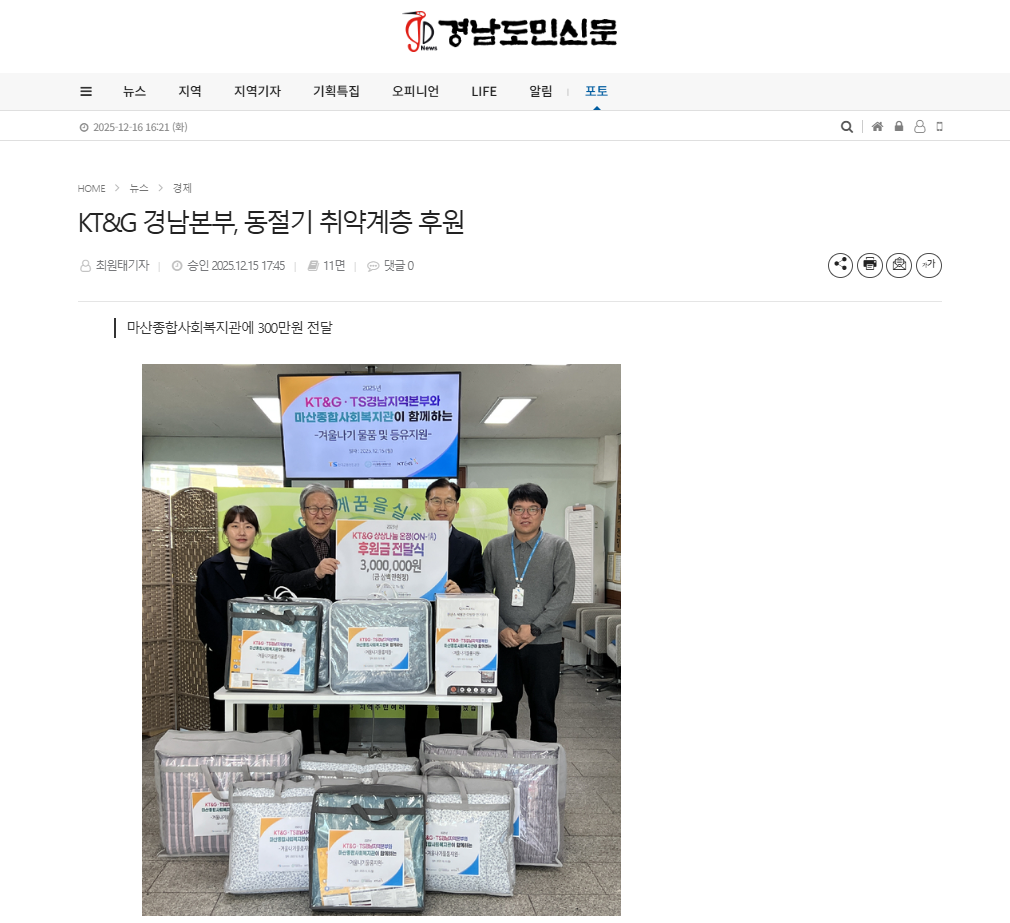 KT&G 경남본부, 동절기 취약계층 후원 <경남도민신문>