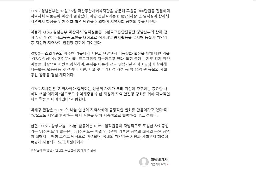 KT&G 경남본부는 12월 15일 마산종합사회복지관을 방문해 후원금 300만원을 전달하며 지역사회 나눔문화 확산에 앞장섰다. 이날 전달식에는 KT&G지사장 및 임직원이 함께해 지역복지 향상을 위한 상호 협력 방안을 논의하며 지역사회 공헌의 뜻을 나눴다.