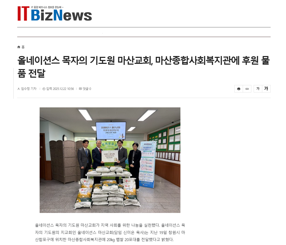 올네이션스 목자의 기도원 마산교회, 마산종합사회복지관에 후원 물품 전달<IT비즈뉴스 외 2곳>