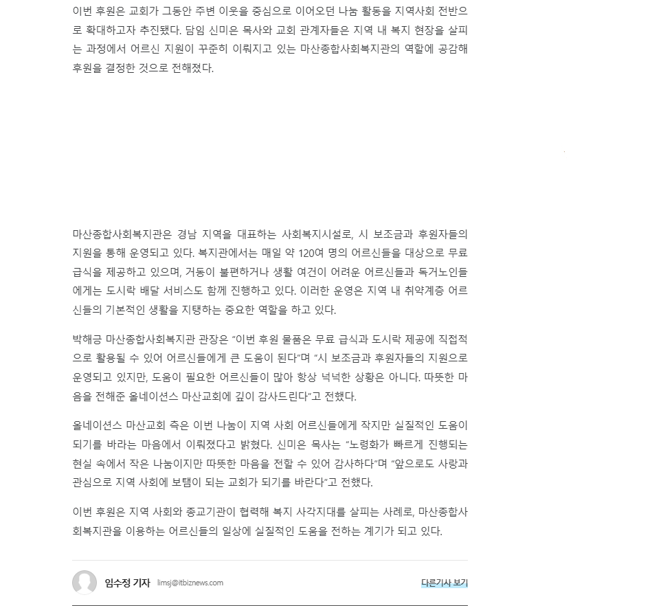 이번 후원은 지역 사회와 종교기관이 협력해 복지 사각지대를 살피는 사례로, 마산종합사회복지관을 이용하는 어르신들의 일상에 실질적인 도움을 전하는 계기가 되고 있다.