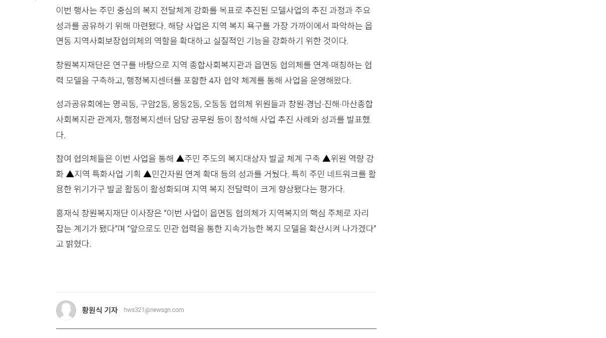 홍재식 창원복지재단 이사장은 “이번 사업이 읍면동 협의체가 지역복지의 핵심 주체로 자리 잡는 계기가 됐다”며 “앞으로도 민관 협력을 통한 지속가능한 복지 모델을 확산시켜 나가겠다”고 밝혔다.