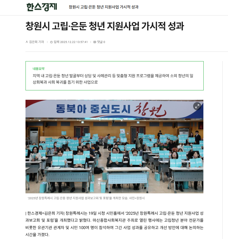 창원시 고립·은둔 청년 지원사업 가시적 성과<한스경제 외 5곳>