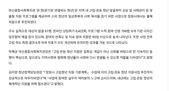 박해긍 마산종합사회복지관장은 “고립·은둔 청년 지원은 일회성 개입이 아닌 신뢰를 바탕으로 한 지속적인 동행이 핵심으로, 앞으로도 지역사회와 협력해 청년들이 사회와 다시 연결될 수 있도록 역할을 다하겠다”고 밝혔다.