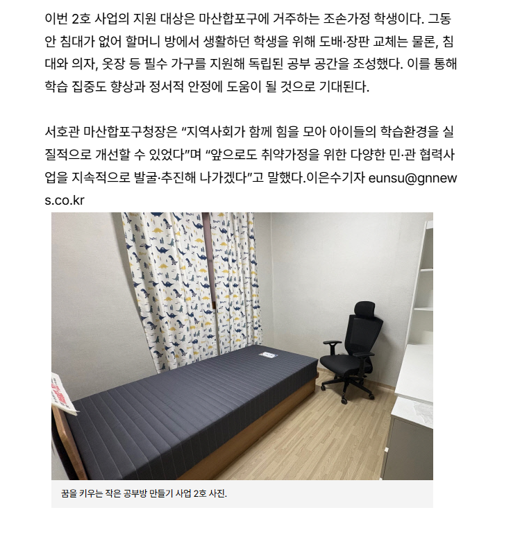 이번 2호 사업의 지원 대상은 마산합포구에 거주하는 조손가정 학생이다. 그동안 침대가 없어 할머니 방에서 생활하던 학생을 위해 도배·장판 교체는 물론, 침대와 의자, 옷장 등 필수 가구를 지원해 독립된 공부 공간을 조성했다. 이를 통해 학습 집중도 향상과 정서적 안정에 도움이 될 것으로 기대된다.