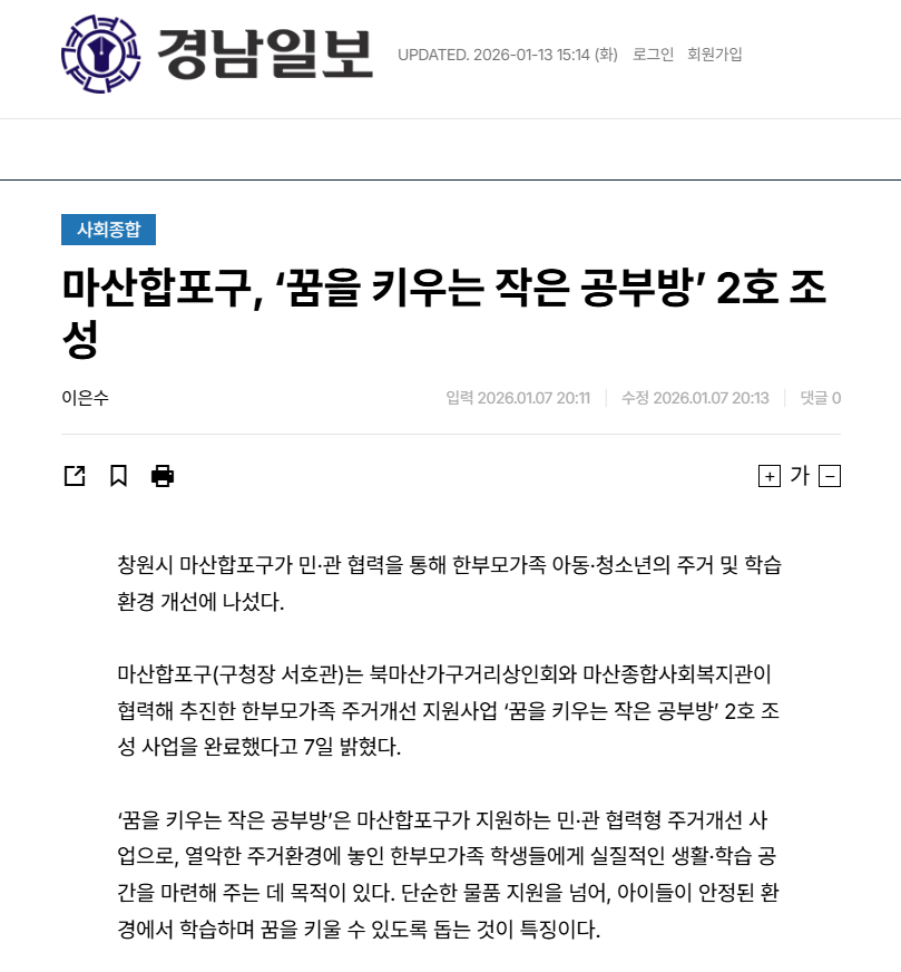 ‘꿈을 키우는 작은 공부방’은 마산합포구가 지원하는 민·관 협력형 주거개선 사업으로, 열악한 주거환경에 놓인 한부모가족 학생들에게 실질적인 생활·학습 공간을 마련해 주는 데 목적이 있다. 단순한 물품 지원을 넘어, 아이들이 안정된 환경에서 학습하며 꿈을 키울 수 있도록 돕는 것이 특징이다.