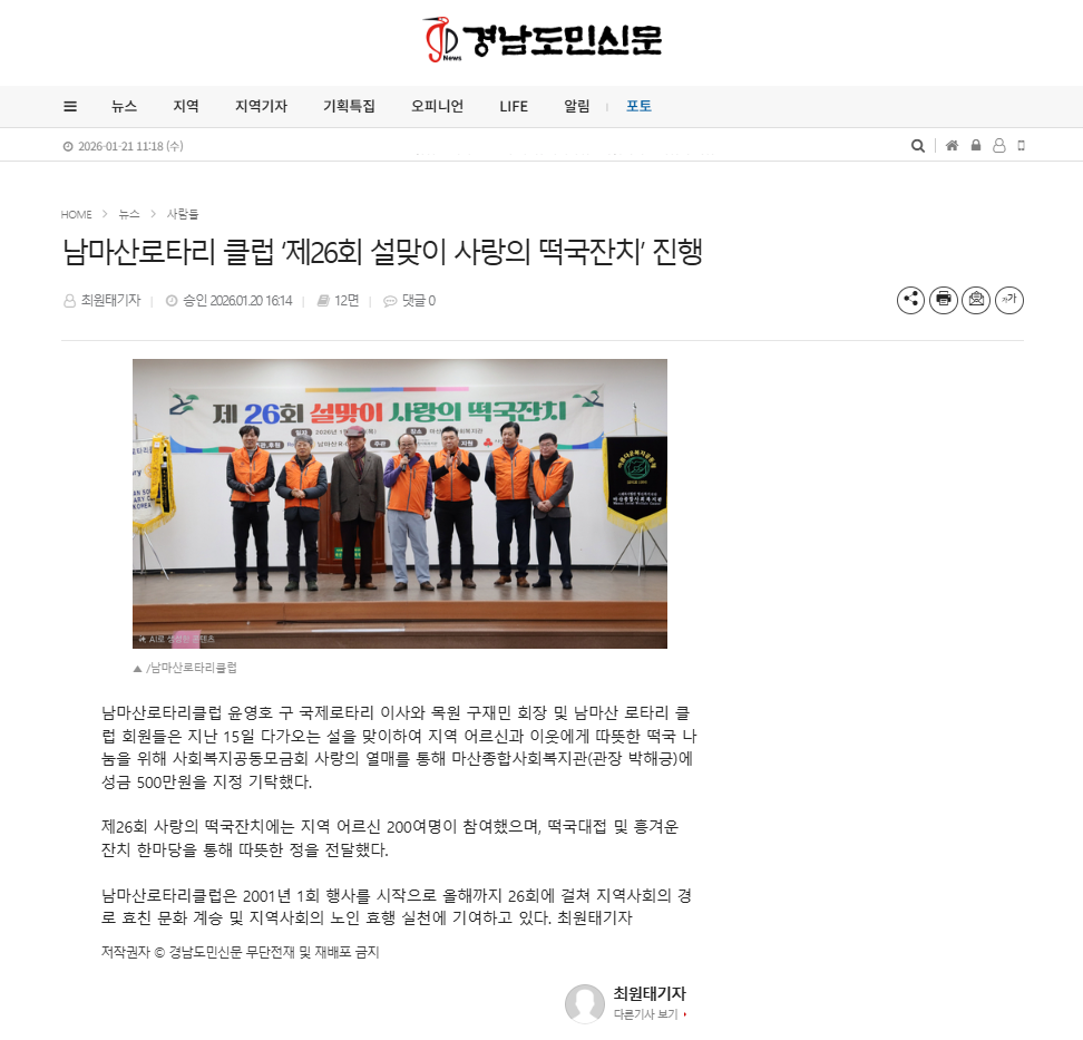 남마산로타리 클럽 ‘제26회 설맞이 사랑의 떡국잔치’ 진행 <경남도민신문>