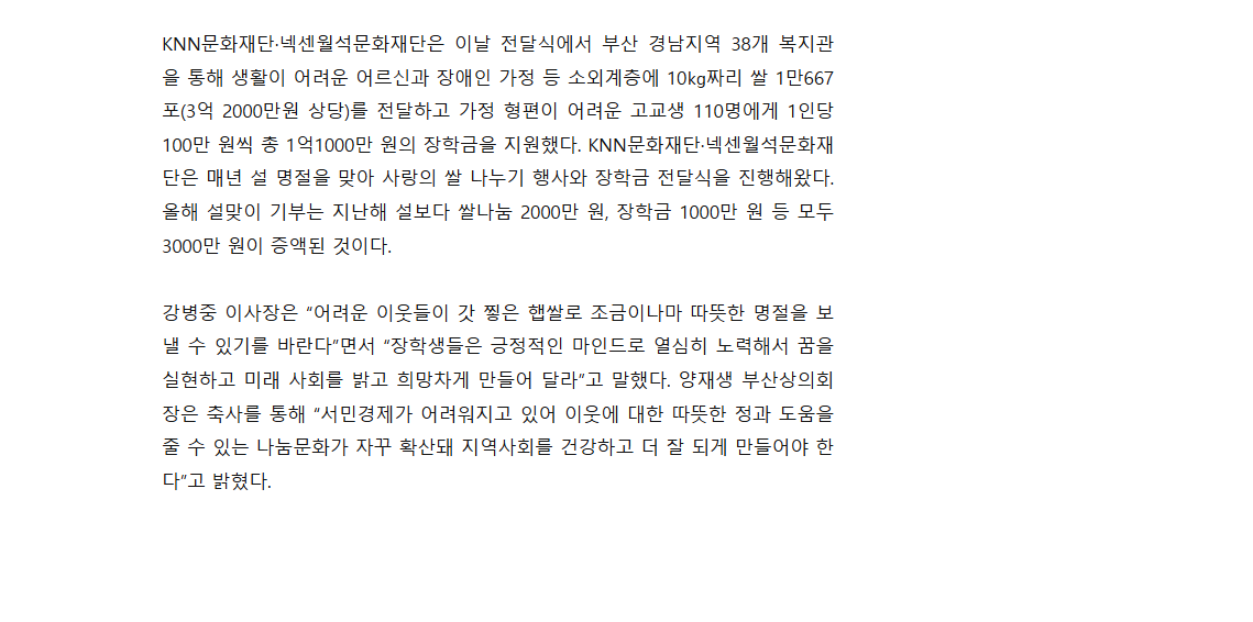 KNN문화재단·넥센월석문화재단은 이날 전달식에서 부산 경남지역 38개 복지관을 통해 생활이 어려운 어르신과 장애인 가정 등 소외계층에 10㎏짜리 쌀 1만667포(3억 2000만원 상당)를 전달하고 가정 형편이 어려운 고교생 110명에게 1인당 100만 원씩 총 1억1000만 원의 장학금을 지원했다. KNN문화재단·넥센월석문화재단은 매년 설 명절을 맞아 사랑의 쌀 나누기 행사와 장학금 전달식을 진행해왔다. 올해 설맞이 기부는 지난해 설보다 쌀나눔 2000만 원, 장학금 1000만 원 등 모두 3000만 원이 증액된 것이다.