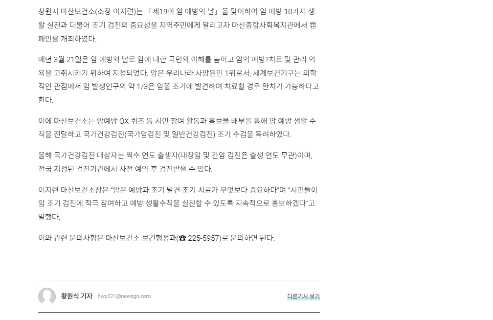 마산보건소, ‘제19회 암 예방의 날’ 캠페인 개최 <뉴스경남>