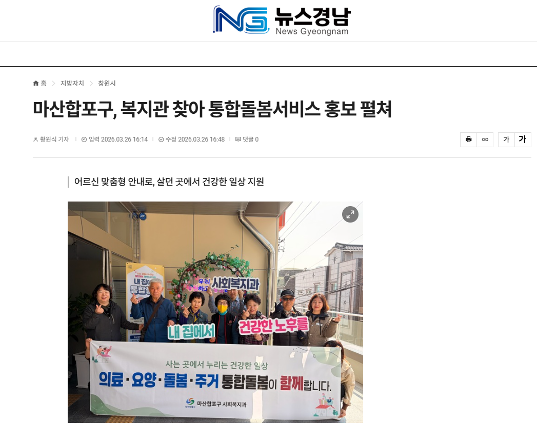 서호관 마산합포구청장은 “지속적인 홍보와 대상자 발굴, 서비스 연계를 통해 어르신들이 살던 곳에서 건강하고 편안한 노후를 보낼 수 있도록 최선을 다하겠다”고 말했다.