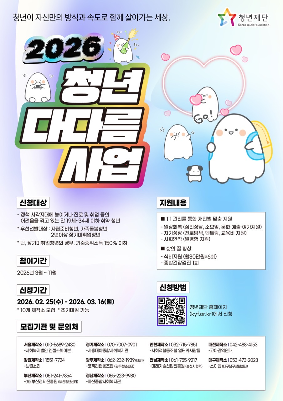마산종합사회복지관에서 2026년 청년 다다름 사업 참여자를 모집합니다. 청년의 새로운 시작을 함께합니다!