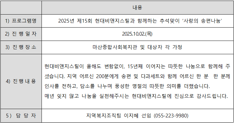 2025년 제15회 현대비앤지스틸과 함께하는 추석맞이 ‘사랑의 송편나눔’