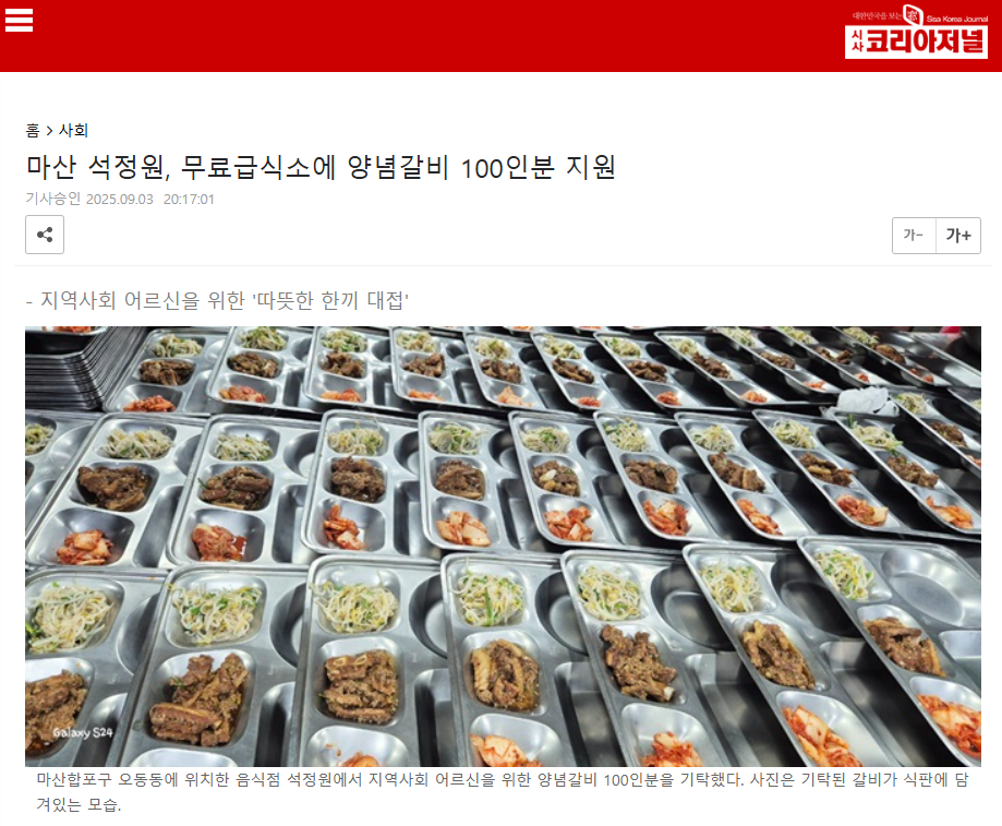 마산 석정원, 무료급식소에 양념갈비 100인분 지원 <코리아저널>