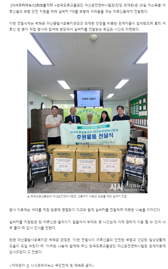 한국도로교통공단 마산운전면허시험장, 교통약자 이동권 보호를 위한 실버카 전달<시사코리아뉴스>