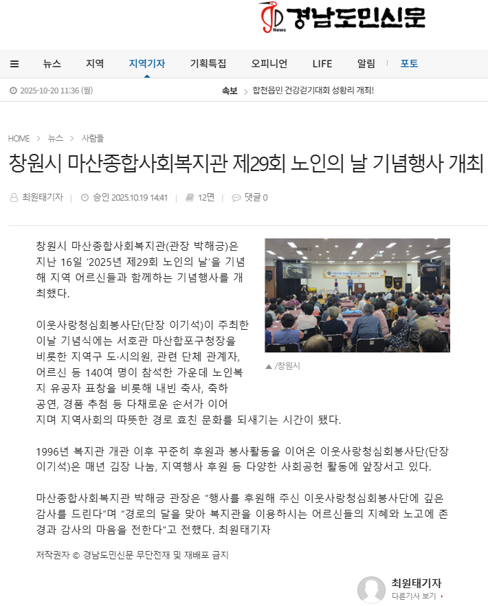 창원시 마산종합사회복지관 제29회 노인의 날 기념행사 개최<경남도민신문 외 3곳>