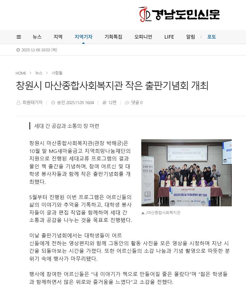 창원시 마산종합사회복지관(관장 박해긍)은 10월 말 MG새마을금고 지역희망나눔재단의 지원으로 진행된 세대교류 프로그램의 결과물인 책 출간을 기념하며, 참여 어르신 및 대학생 봉사자들과 함께 작은 출판기념회를 개최했다.