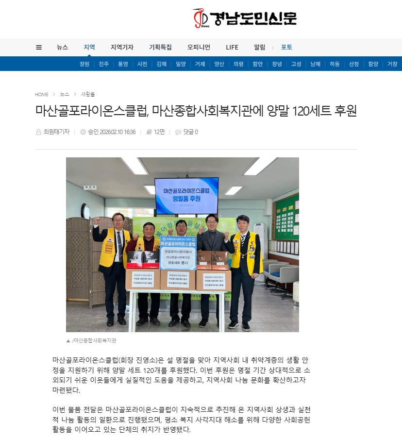 마산골포라이온스클럽(회장 진영소)은 설 명절을 맞아 지역사회 내 취약계층의 생활 안정을 지원하기 위해 양말 세트 120개를 후원했다. 이번 후원은 명절 기간 상대적으로 소외되기 쉬운 이웃들에게 실질적인 도움을 제공하고, 지역사회 나눔 문화를 확산하고자 마련됐다.