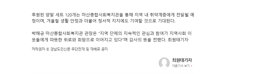 후원된 양말 세트 120개는 마산종합사회복지관을 통해 지역 내 취약계층에게 전달될 예정이며, 겨울철 생활 안정과 더불어 정서적 지지에도 기여할 것으로 기대된다.