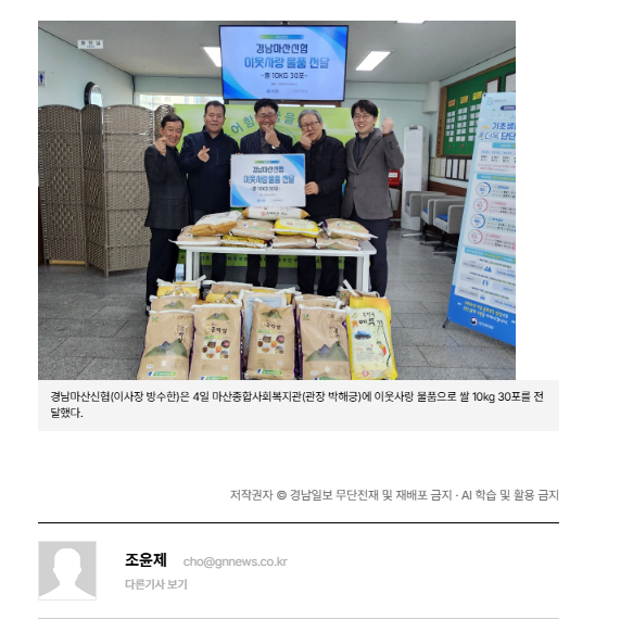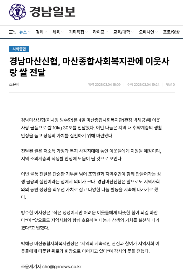 경남마산신협, 마산종합사회복지관에 이웃사랑 쌀 전달 <경남일보 외 1곳>